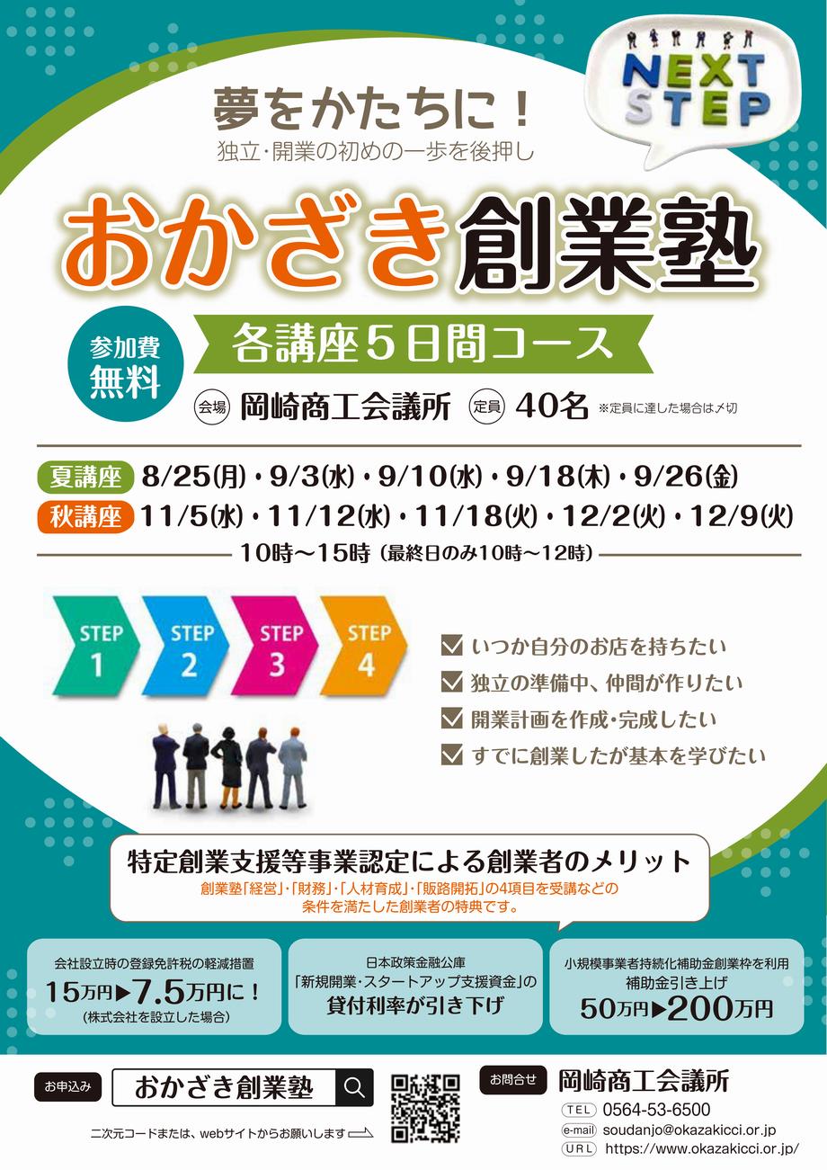 おかざき創業塾 夏講座は8月25日(月)から全5日間の開催になります。
